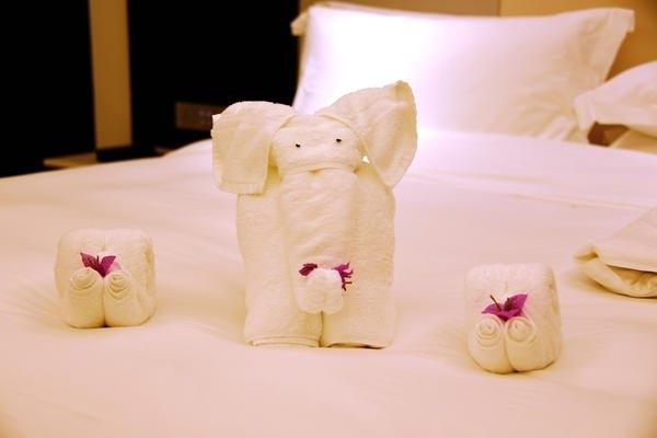 超寬大的床,可以睡兩大一小,隨意翻滾也不會(huì)掉下來。大象爸爸帶著蝸牛寶寶在微笑著迎接我們的到來,