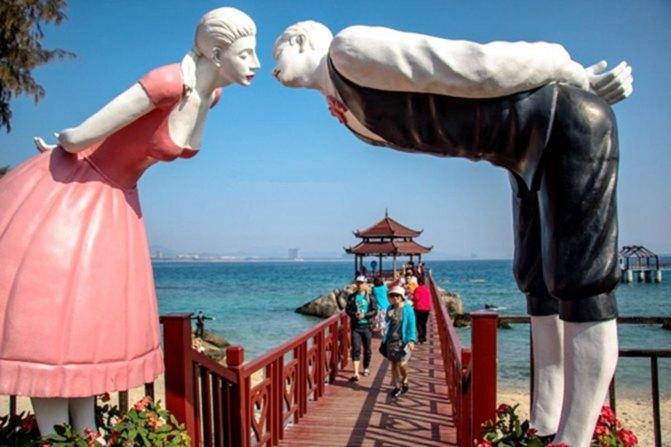 愛情廣場(chǎng)中的天涯海角星,在天涯海角有五大奇石:天涯石、海角石、日月石、南天一柱和天涯海角星。在雕塑的中心懸掛著一顆碩大的水晶,每一個(gè)來到天涯海角的游客都會(huì)過來跟這顆水晶球合影,由于當(dāng)?shù)厝藭?huì)通知大家,這顆水晶球會(huì)帶來好運(yùn),托起水晶球拍照意味著托起幸福。整個(gè)廣場(chǎng)和雕塑的布置都遵照中國(guó)傳統(tǒng)的風(fēng)水原理,匯集了滿滿的福氣。很多游客都會(huì)托起天涯海角星,拍一張