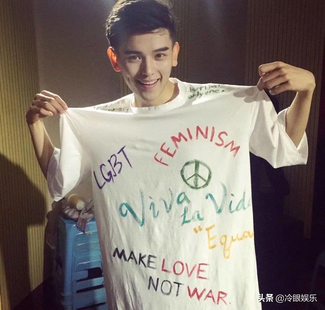 這不是他作為一個藝人給自己立的人設(shè),因為在更早更早,在還是素人時期的微博里,姚弛就穿過自己手繪的,寫著LGBT、女性主義、反戰(zhàn)、生命無上等等標(biāo)語的T恤。