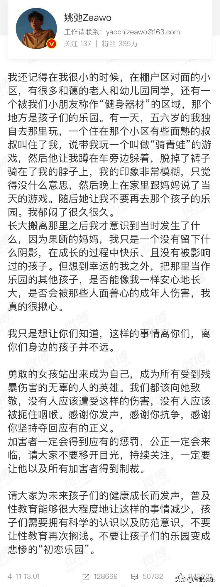 鮑毓明事件被廣泛關(guān)注那會,有很多男明星都轉(zhuǎn)發(fā)過人民日報的微博表示“哥哥來了”再配兩個憤怒表情,但姚弛沒轉(zhuǎn)微博也沒打tag,他只發(fā)了一段與自己有關(guān)的童年經(jīng)歷,呼吁大家為孩子的健康成長發(fā)聲,不要讓性教育擱淺。