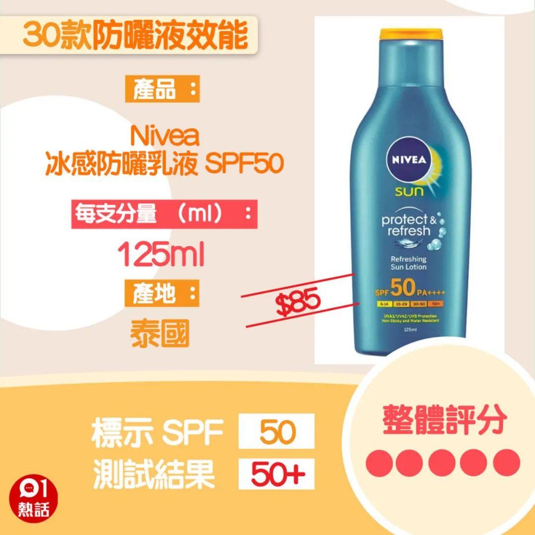 售價(jià)85元「Nivea」冰感防曬乳液SPF50,竟然和485元「Chanel」UV Essential Protection Globale Complete Protection UV Pollution分?jǐn)?shù)是一樣的,但兩者的價(jià)錢卻相差5.7倍!有興趣的朋友可以買來試試噢。(沒有打廣告的意思喲)