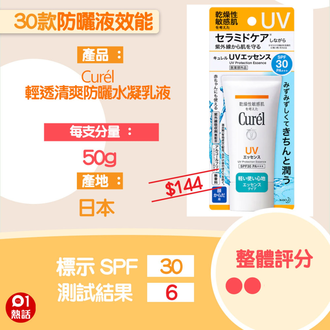而「Curél」輕透清爽防曬水凝乳液,相信不少人有用過,測試出的SPF值和標(biāo)示的差距是大,實(shí)際測得的SPF值只有9.8,與標(biāo)示相差2倍。