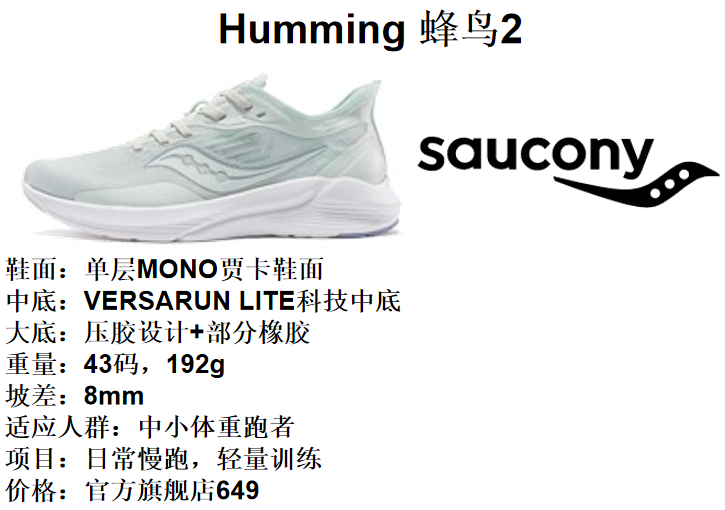 作為索康尼的入門級緩震跑鞋,蜂鳥2代具有重量輕,穿著舒適的優(yōu)點(diǎn)。適合慢跑,輕量運(yùn)動,日常穿搭。
