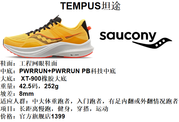 配置:工程提花網(wǎng)布鞋面?,TPU導(dǎo)向框架+PWRRUN+科技中底, XT-900橡膠大底。重量:42.5碼,323g。坡差:8mm。