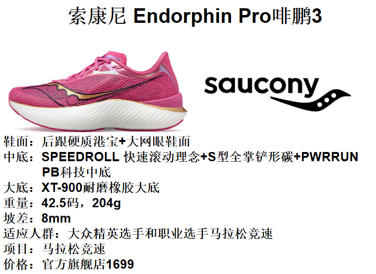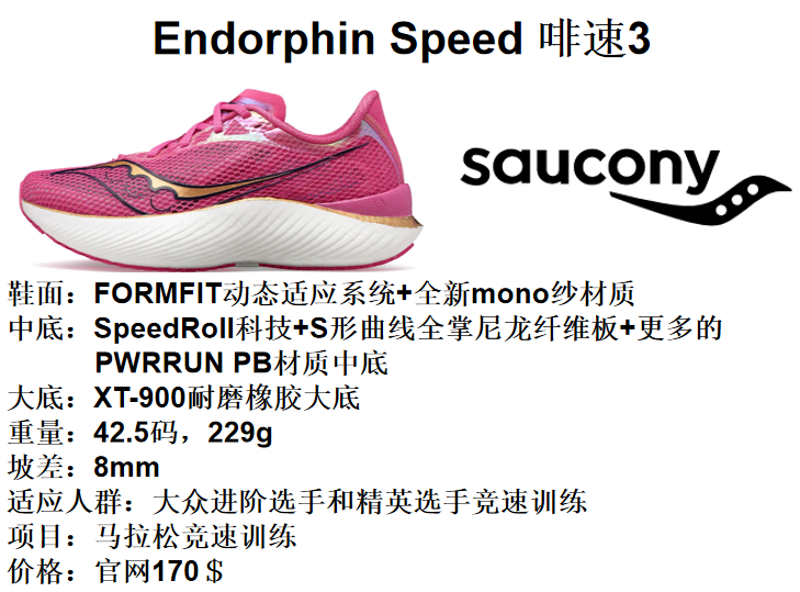 配置:后跟硬質(zhì)港寶+大網(wǎng)眼鞋面,SPEEDROLL 快速滾動理念+S型全掌鏟形碳板+PWRRUN PB科技中底,XT-900耐磨橡膠大底。重量:42.5碼,204g。坡差:8mm。