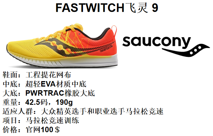 作為薄底競速跑鞋,F(xiàn)ASTWITCH飛靈 9具有的重量控制和鞋身穩(wěn)定性,適合精英選手路跑訓(xùn)練和大眾選手中距離場地競速和間歇訓(xùn)練。