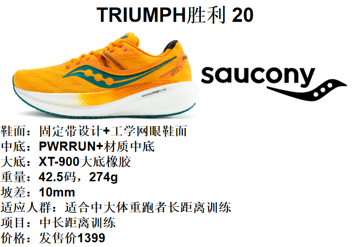 配置:環(huán)抱式側(cè)墻+工程提花網(wǎng)布鞋面?,TPU框架+PWRRUN材質(zhì)中底, XT-900橡膠大底。重量:42.5碼,269g。坡差:8mm。