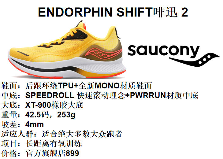 配置:TPU穩(wěn)定片+全新mono紗材質(zhì)鞋面?,SPEEDROLL 快速滾動理念+PWRRUN材質(zhì)中底,XT-900橡膠大底。重量:42.5碼,253g。坡差:4mm。