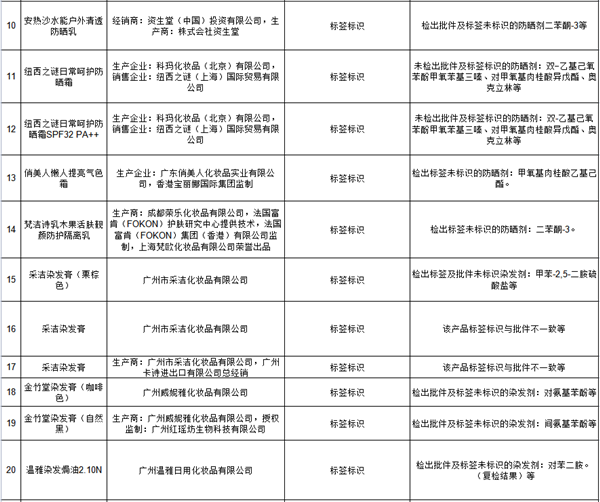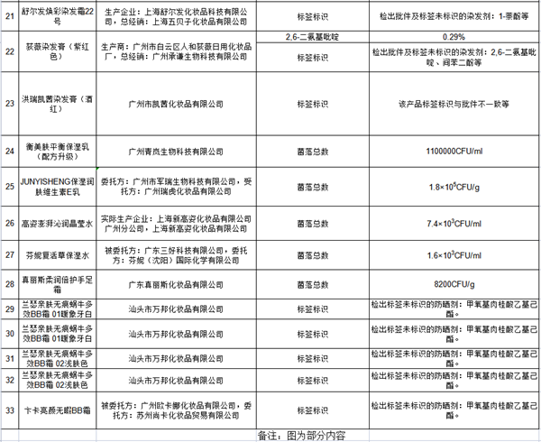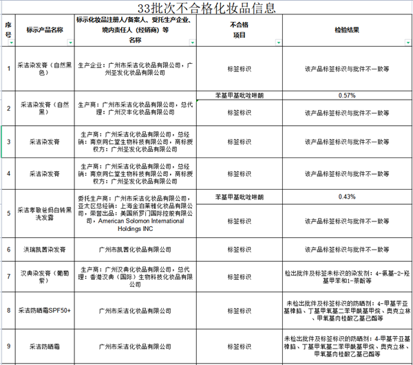 通告顯示,在2021年化妝品監(jiān)督抽檢工作中,經(jīng)河南省食品藥品檢驗(yàn)所等單位檢驗(yàn),標(biāo)示為廣州市采潔化妝品有限公司生產(chǎn)的采潔染發(fā)膏、廣州市凱茜化妝品有限公司生產(chǎn)的洪瑞凱茜染發(fā)膏、廣州漢典化妝品有限公司生產(chǎn)的漢典染發(fā)膏(葡萄紫)、上海新高姿化妝品有限公司廣州分公司生產(chǎn)的高姿澎湃沁潤(rùn)晶瑩水、廣東真麗斯化妝品有限公司生產(chǎn)的真麗斯柔潤(rùn)倍護(hù)手足霜等33批次化妝品不合格。其中14批次不合格產(chǎn)品標(biāo)簽上標(biāo)示的化妝品注冊(cè)人、備案人、受托生產(chǎn)企業(yè)、境內(nèi)責(zé)任人(經(jīng)銷商)否認(rèn)生產(chǎn)或者進(jìn)口過(guò)上述產(chǎn)品。