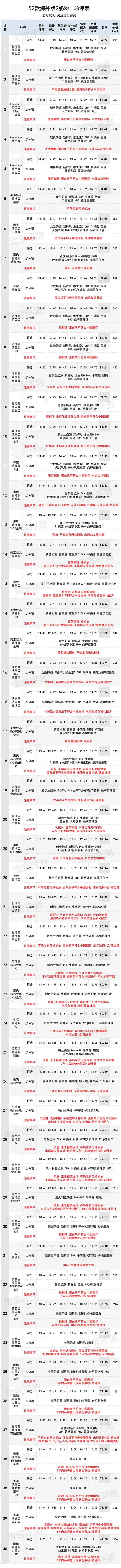 評(píng)測(cè)版本本期海外版2段評(píng)測(cè)的奶粉品牌,與1段橫評(píng)相同,包括了:愛他美、諾優(yōu)能、雅培、美贊臣、惠氏、美素佳兒、herobaby、雀巢、牛欄、佳麗雅、可瑞康、森寶、a2、安滿,共計(jì)52款。