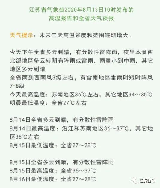 江蘇省氣象臺(tái)2020年08月13日10時(shí)30分升級(jí)發(fā)布高溫橙色預(yù)警信號(hào):預(yù)計(jì)今天全省大部分地區(qū)將出現(xiàn)35℃以上高溫,其中常州、無(wú)錫、蘇州、南通和泰州中南部地區(qū)高溫度可達(dá)37℃以上。