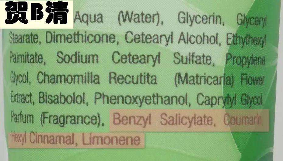 主要先來說說賀B清,這款護手霜含有4種調(diào)香物質(zhì)(香豆素、己基肉桂醛、檸檬烯、水楊酸芐酯),屬于歐盟規(guī)定的26種易致敏香精,皮膚敏感寶媽要注意了!