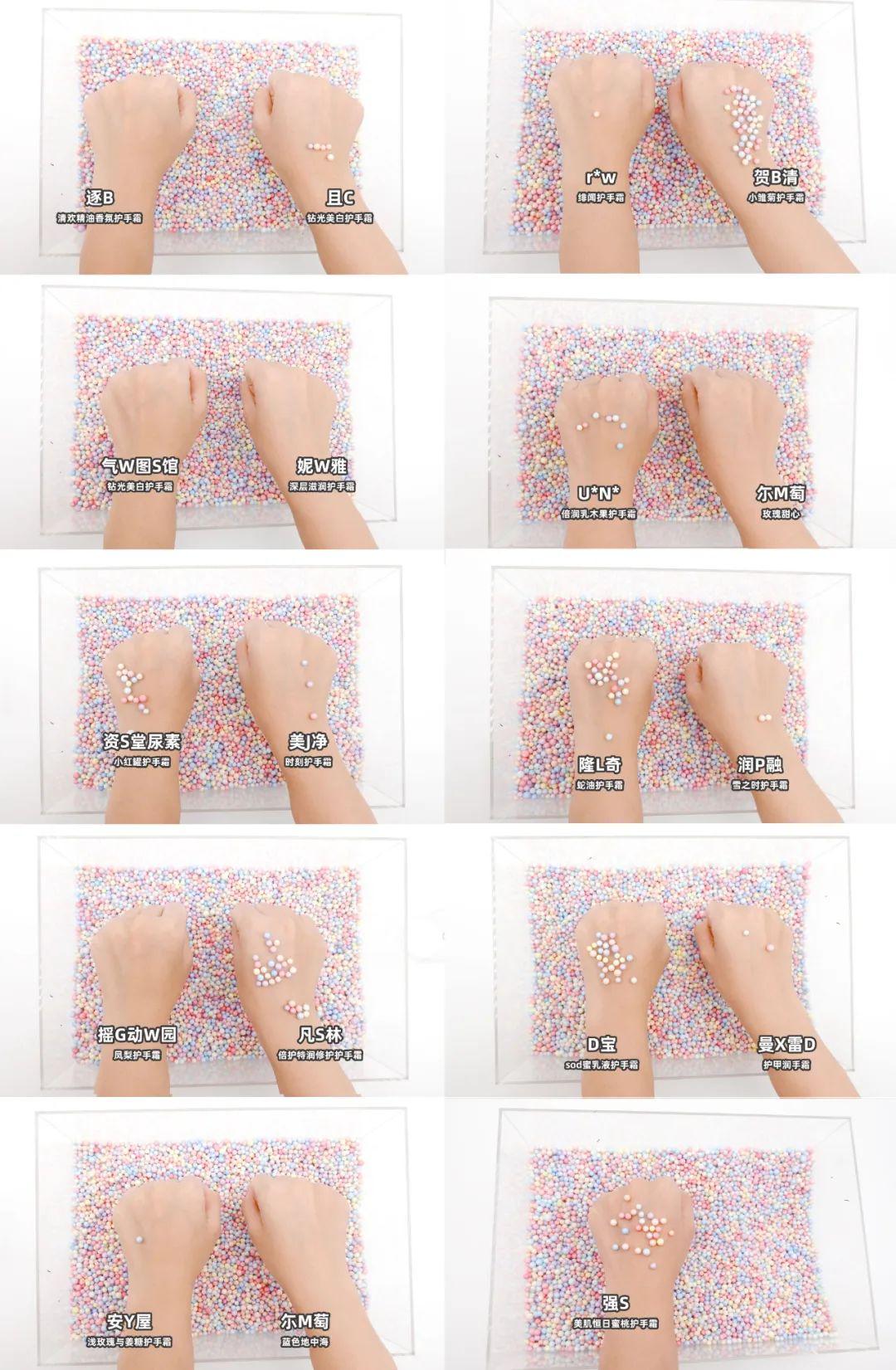 測試方法:取等量面霜,在手背上均勻涂抹,5min后將泡沫小球倒在手上,觀察被黏住的小球數(shù)量,比較手部皮膚的清爽度。