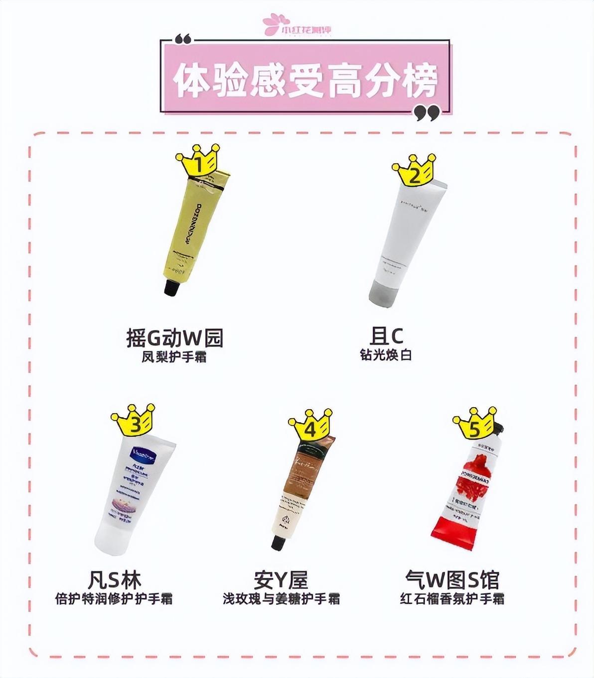 使用評價花爸還呼喚了幾位同事來進行涂抹,并填寫調(diào)查問卷(內(nèi)容包括包裝、質(zhì)地、推開程度、油膩度、氣味),得到下面幾個“體驗高分護手霜”。