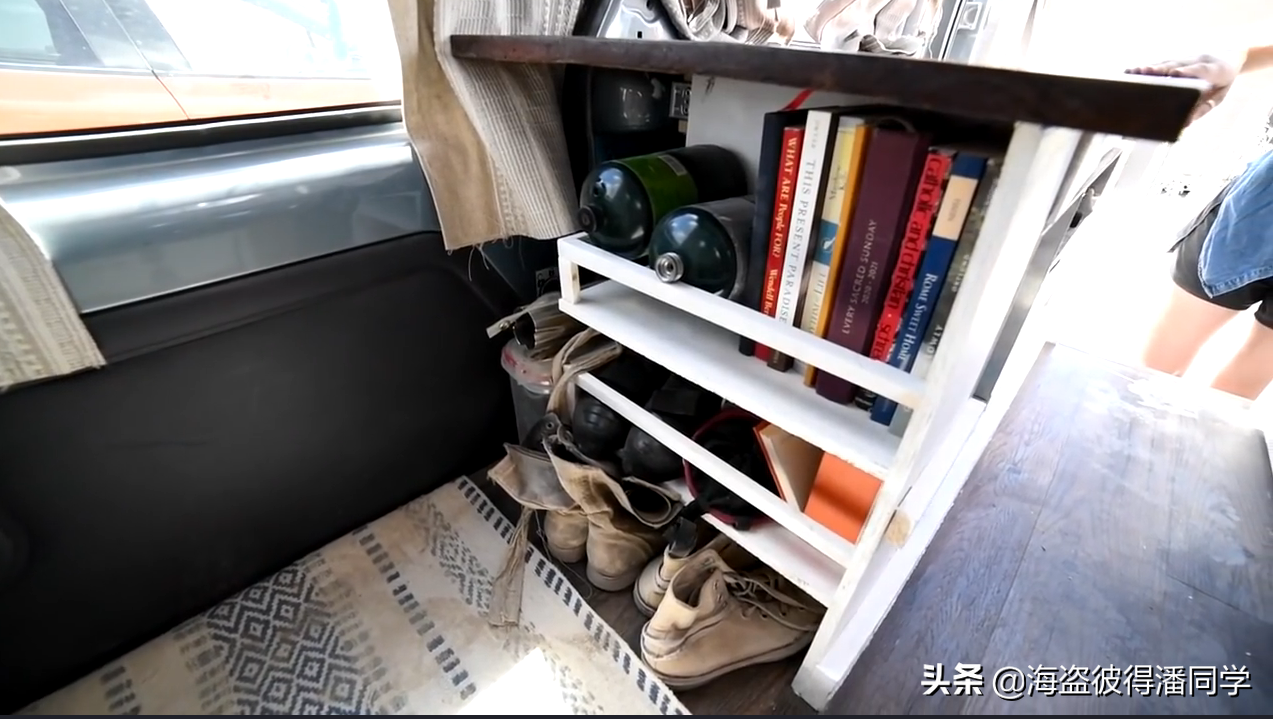 先開始的是鞋柜,因為在北美戶外生活豐富,作為車主不能不兼顧到自己的戶外生活,多雙不同功能的鞋子是剛需,自然需要鞋柜。鞋柜在櫥柜的盡頭,右側(cè)側(cè)滑門的門口,上門可以放鞋,后門上車也方便換鞋。