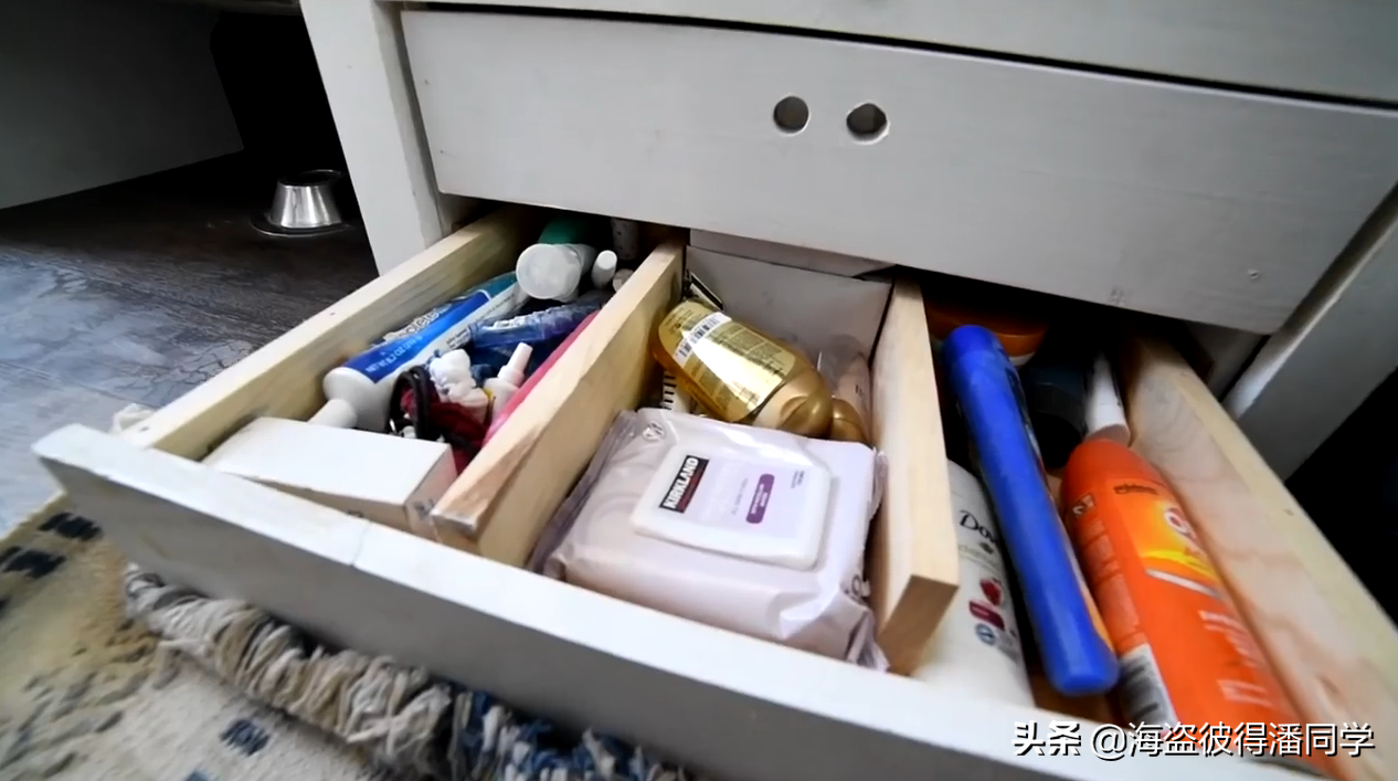 駕駛室頭頂做成了一個儲物空間,可以放平常高頻使用的墨鏡、帽子、還有墊子等等。儲物空間下沿可以掛窗簾。儲物空間就是加裝一塊鋁合金隔板,又便宜又輕。