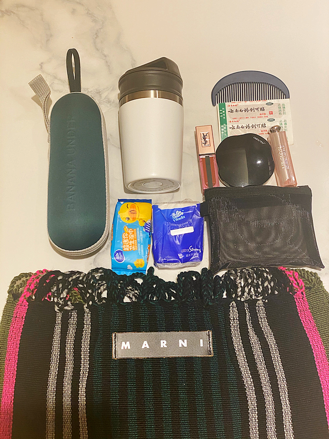作為一個(gè)廣告行業(yè)從業(yè)者,必須隨時(shí)準(zhǔn)備工作,一般上班都背著可以裝電腦的大包,出去玩的時(shí)候就怎么簡(jiǎn)單怎么來。日常出門我用Dior相機(jī)包,因?yàn)榛径紩?huì)帶妝,所以包包里東西會(huì)零碎一點(diǎn)。上班的話因?yàn)橐獢y帶電腦,所以是比較能裝的MUJI“十八塊”亞麻手提袋。