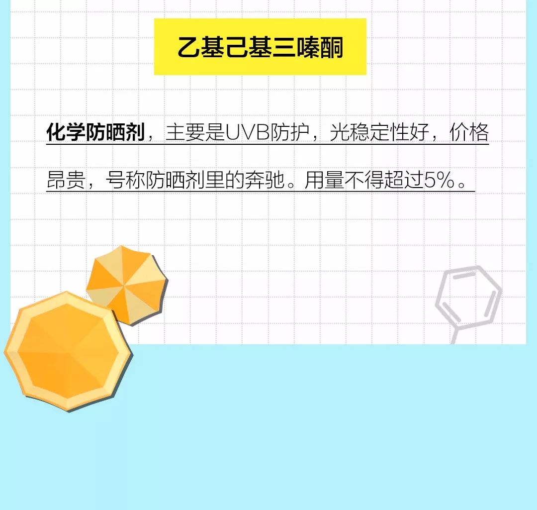 二苯甲酰甲烷、二苯甲酮、二甲基辛脂、對(duì)氨基芐酸、肉桂酸鹽、二羥基丙酮、苯酚類。