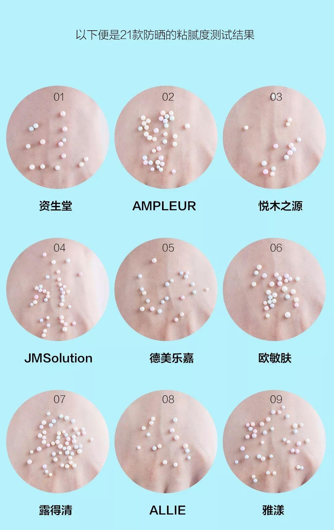 綜合粘膩度和質(zhì)地測(cè)試,可以看出搖搖樂類的防曬霜整體清爽、不黏膩、吸收快(以資生堂、悅木之源、Fancl等為代表);而成膜感且好的,粘膩感也更一些(以JM、理膚泉等為代表)。純物理防曬(露得清)容易泛白,日系防曬(SOFINA、雪肌精)都帶有微微提亮的妝。