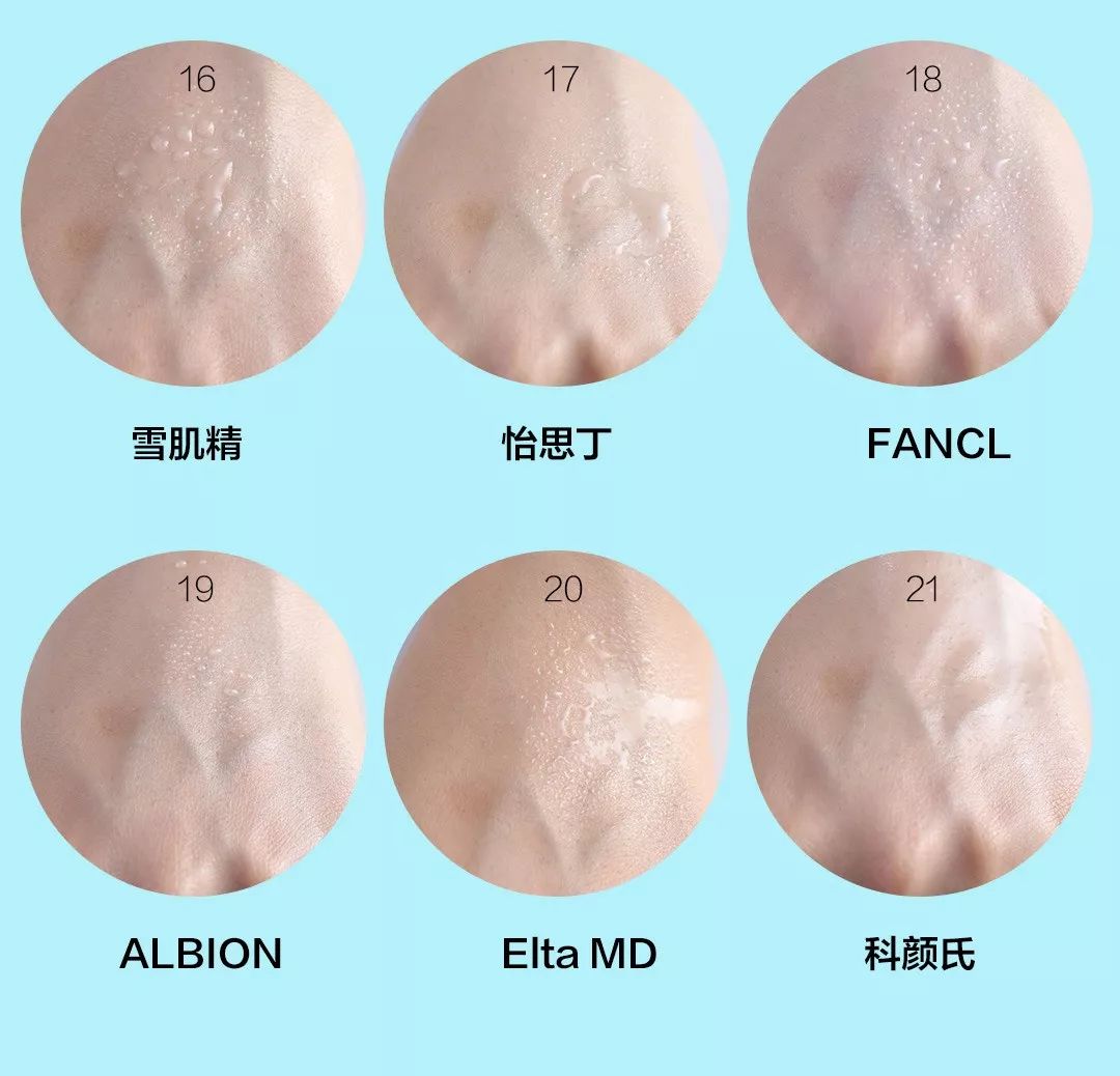 ?7.露得清:白色的乳液質(zhì)地,涂抹開來(lái)白,吸收了一段時(shí)間后,肌膚上依舊有泛白感,遇水也有微微白色粉末泛出。