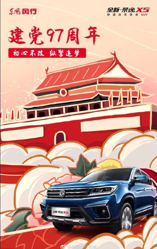 東風風行景逸X5在建黨97周年時打出“初心不改,縱擎追夢”的廣告語,進而顯示該款車型“舒適派高質(zhì)感SUV”的產(chǎn)品理念。