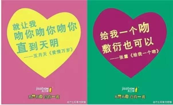 杰士邦在國際接吻日時,借助一些耳熟能詳?shù)母柙~進行宣傳。從五月天的《愛情萬歲》到張震的《給我一個吻》,再加上心形這一形狀,進而營銷“國際接吻日”與愛情、親密相關(guān)的點。