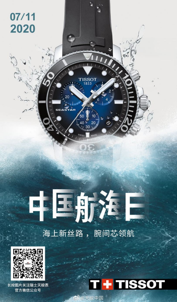 TISSOT在2020年中國航海日時的宣傳標語是:海上新絲路,腕間芯領(lǐng)航。其海報以海洋浪花為背景,將自身產(chǎn)品“腕表”置于海浪之上。