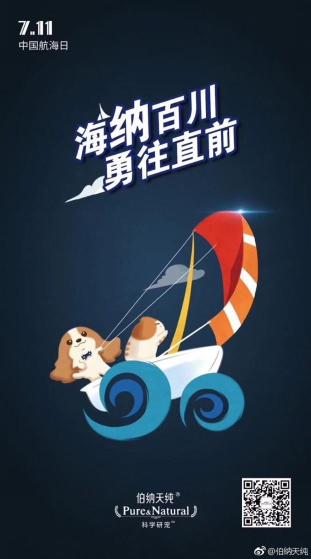 2018年的“中國航海日”,伯納天純打出了“海納百川,勇往直前”的標語。在海報中,是兩只狗狗正在揚帆起航的畫面,既結(jié)合了“航?!边@一特點,也與品牌自身從事寵物食品行業(yè)這一特點相結(jié)合。