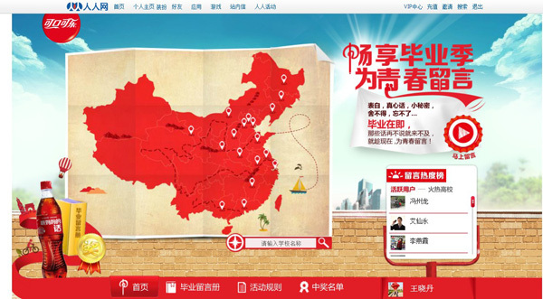 2014年畢業(yè)季,可口可樂攜“歌詞瓶”登陸人人網(wǎng),為畢業(yè)生們帶來“暢想畢業(yè)季 為青春留言”系列活動,鼓勵畢業(yè)生們與好友互動、為好友留言?;顒舆€設(shè)置了留言熱度榜,參與活動的人人網(wǎng)網(wǎng)友均可輸入自己母校的名稱,查看它在熱度榜中的排名。