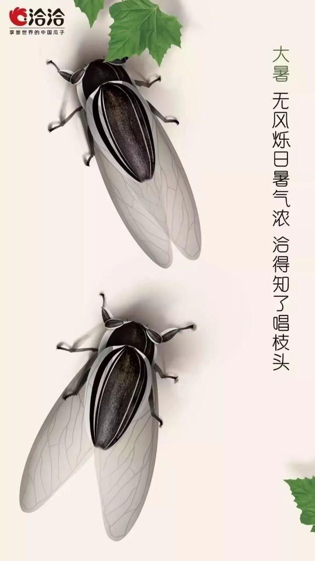洽洽在大暑時的營銷,海報設(shè)計以兩只知了為主體,同時標語中的“洽”字呼應(yīng)了品牌自身。夏日暑氣重,知了唱枝頭,一起“洽”瓜子吧!