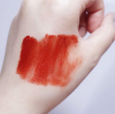 剛上唇就是那種唇釉的質(zhì)地,之后很快會(huì)變成啞光感的,一點(diǎn)也不拔干。這支真的算橙紅色系口紅里面很特別的一支了,重點(diǎn)!我一直都沒有找到這支的替代色,所以你們懂它的美。