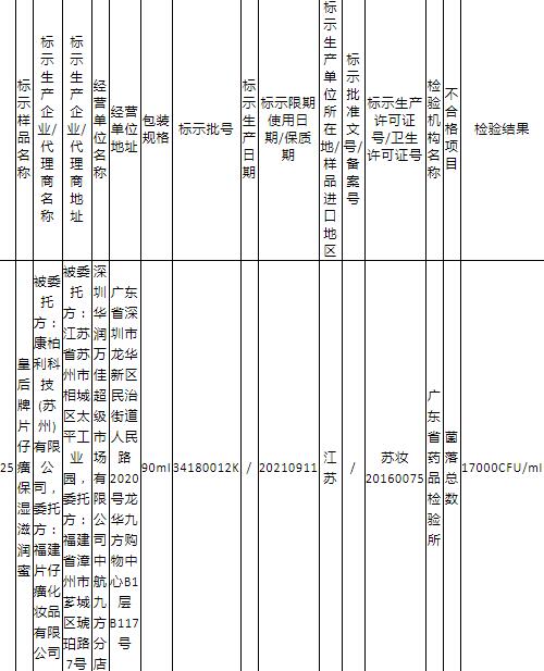 其中,由深圳華潤萬佳市場有限公司中航九方分店經(jīng)營銷售的皇后牌片仔癀保濕滋潤蜜抽查顯示菌落總數(shù)不合格,檢驗結(jié)果為17000CFU/ml。這批不合格產(chǎn)品由福建片仔癀化妝品有限公司委托康柏利科技(蘇州)有限公司生產(chǎn),包裝規(guī)格為90ml,標(biāo)示批號為34180012K,標(biāo)示限期使用日期/保質(zhì)期為20210911,標(biāo)示生產(chǎn)許可證號/衛(wèi)生許可證號為蘇妝20160075,檢驗機(jī)構(gòu)為廣東省藥品檢驗所。