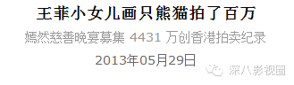 七歲的時候,在嫣然晚宴上她的一幅畫拍出了百萬港元。當時曾志偉當拍賣師,起價是十萬,第二個叫價的人就喊出了百萬,曾志偉也是驚呆了。買走畫的是一名女子,號稱“內地女股神”。