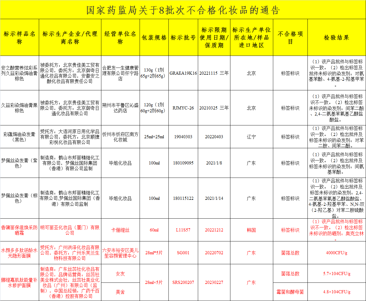 其中高達5批次為染發(fā)類產品,均涉及標簽標識不合格,具體包括:朔州市平魯區(qū)沁盛達藥店銷售的、標稱北京御奇日通化妝品有限公司委托北京貴佳美工貿有限公司生產的久益彩染焗油膏栗棕色,以及北京御奇日通化妝品有限公司、安徽安之酸化妝品有限責任公司委托北京貴佳美工貿有限公司生產的安之酸營養(yǎng)炫彩系列久益彩染焗油膏棕色等等。