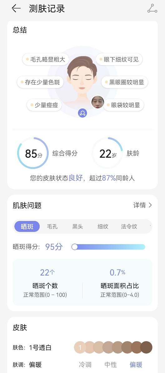 而超光譜影像單元還是一款“測膚神器”。例如當你早上出門的時候需要涂抹防曬霜,你用肉眼看不出來是否涂抹均勻。這時你點擊華為P50 Pocket的外屏進入鏡子App,點擊后會進入防曬檢測界面,大家看到顯示顏色很深的區(qū)域就是已經(jīng)涂抹均勻了。除此之外,你也可以用來檢測防曬霜是否卸妝干凈,而華為P50 Pocket上的AI測膚軟件比較特別的是,它通過超光譜影像技術可以深層檢測皮膚狀態(tài),比普通測膚軟件增加了曬斑檢測的單元,我們可以根據(jù)智能語音提示進行操作,它會告訴我們的曬斑狀況然后輸出護理建議。而且P50 Pocket同時還能根據(jù)天氣變化情景感知,提醒用戶紫外線指數(shù),并提供相應防曬霜涂抹指數(shù)的建議,不得不說真是一款“護膚神器”??!