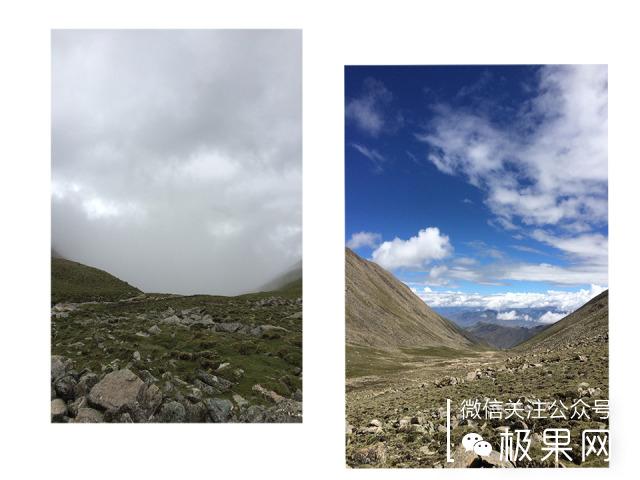 早上從黑布村開始爬升,天氣變化莫測。一開始多云,云越來越厚,走到山谷深處,起了大霧。然而過了一個小時,當我們快到埡口時,云開霧散,又晴空了。下圖為一個小時前后天氣的對比。