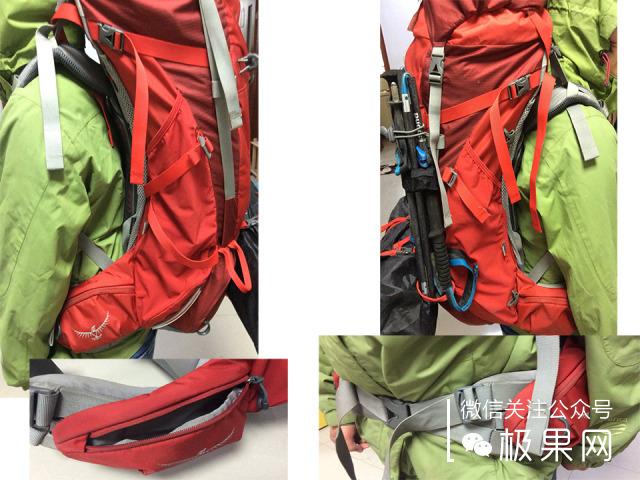 4、外掛系統(tǒng)多,可以掛很多東西,還有專門設(shè)計放冰鎬的位置。主倉外面的尼龍倉里可以放頭盔,左右側(cè)邊的彈力口袋很深,存放水杯等雜物方便。彈力帶有上下兩個開口,可以充分利用彈力帶里的空間,存放更多的東西。