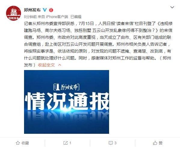 記者從鄭州市委宣傳部獲悉,7月15日,人民日報“讀者來信”欄目刊登了《違規(guī)修建跑馬場、高爾夫練習場、獨棟別墅 五云山開發(fā)亂象緣何得不到整治?》的來信調查。鄭州市委、市政府對此高度重視,當天成立了由市、區(qū)有關部門組成的聯(lián)合調查組,赴上街區(qū)對五云山開發(fā)問題開展調查。鄭州市相關負責人告訴記者,將按照實事求是、依法依規(guī)的原則,對發(fā)現(xiàn)的問題不遮掩、查清楚、改到底,有什么問題就處理好什么問題。同時,感謝媒體對鄭州工作的監(jiān)督與幫助。