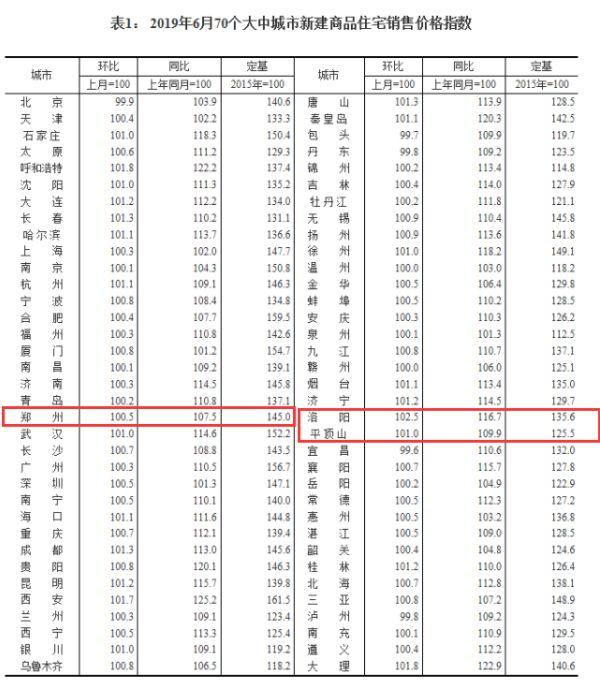 6月份70城房價出爐!7月15日,統(tǒng)計局發(fā)布了2019年6月份70個大中城市商品住宅銷售價格變動情況統(tǒng)計數據。整體來看,6月有63城新建商品住宅價格環(huán)比上漲,較5月減少4城。其中,新房價格環(huán)比漲幅居首的城市是洛陽,漲2.5%領跑;鄭州環(huán)比漲0.5%,北上廣深分別跌0.1%、漲0.3%、漲0.3%、漲0.5%。