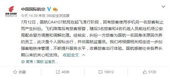 15日,@中國國際航空 就“監(jiān)督員”回應:經核實,糾紛一方旅客為國航一名因身體原因休養(yǎng)的員工,此次是個人因私出行,并非國航監(jiān)督員。將根據相關規(guī)定進一步加強客艙秩序管理,不斷提升服務水平,改良旅客出行體驗。