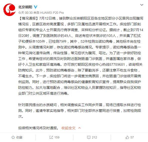 據@北京朝陽 15日通報,7月12日晚,接群眾反映朝陽區(qū)豆各莊地區(qū)部分小區(qū)居民出現(xiàn)腹瀉情況。據統(tǒng)計,截止到7月14日20時,調查了到醫(yī)院就診的49人、自述有癥狀未就診的105人,并采集了肛拭子和便標本105件,已檢測79件,其中,52件檢測出諾如病毒,其他標本尚在檢測中。從調查情況判斷,存在諾如病毒感染情況。針對居民提出的水質疑問,相關調查核實工作同步開展,現(xiàn)場已提取水樣進行檢測。同時,邀請專家實地指導,相關部門對全部供水管網進行排查,加密檢測頻次。后續(xù)相關情況將及時通報。