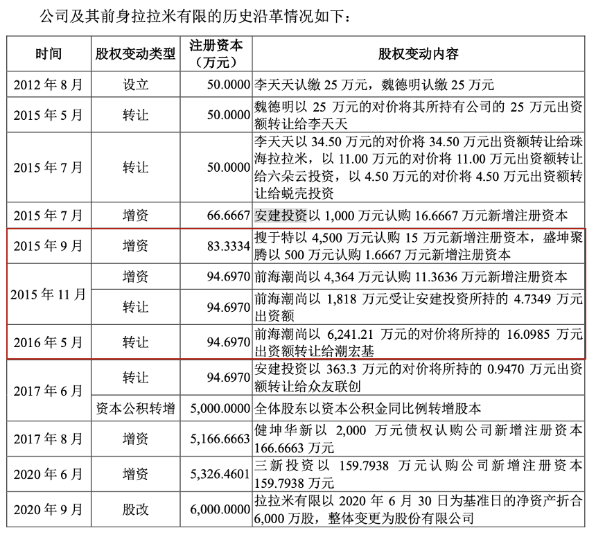 兩家上市公司為大股東拉拉米成立于2012年8月,由李天天、魏德明各自認(rèn)繳25萬元??v觀拉拉米的股權(quán)歷史沿革,可以發(fā)現(xiàn)2015年是拉拉米的融資高潮,包括兩家上市公司搜于特(002503.SZ)、潮宏基(002345.SZ)的投資。其中潮宏基通過全資子公司前海潮尚入股。
