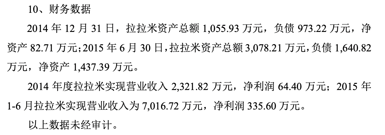 但界面新聞記者注意到,僅2個月時間拉拉米的估值暴漲。根據(jù)2015年7月安建投資的增資情況,公司對應(yīng)估值0.4億元,而9月搜于特投資時估值到了2.5億元,漲幅達(dá)到525%。