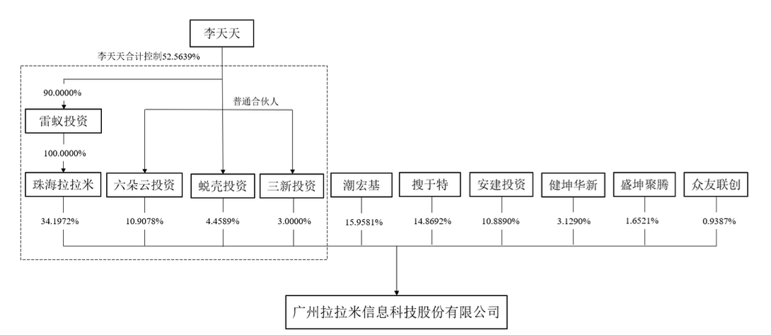 IPO前,公司的實(shí)控人為李天天,其通過珠海拉拉米、六朵云投資、蛻殼投資和三新投資控制公司52.5639%的投票表決權(quán),間接持有公司46.7620%的股份。