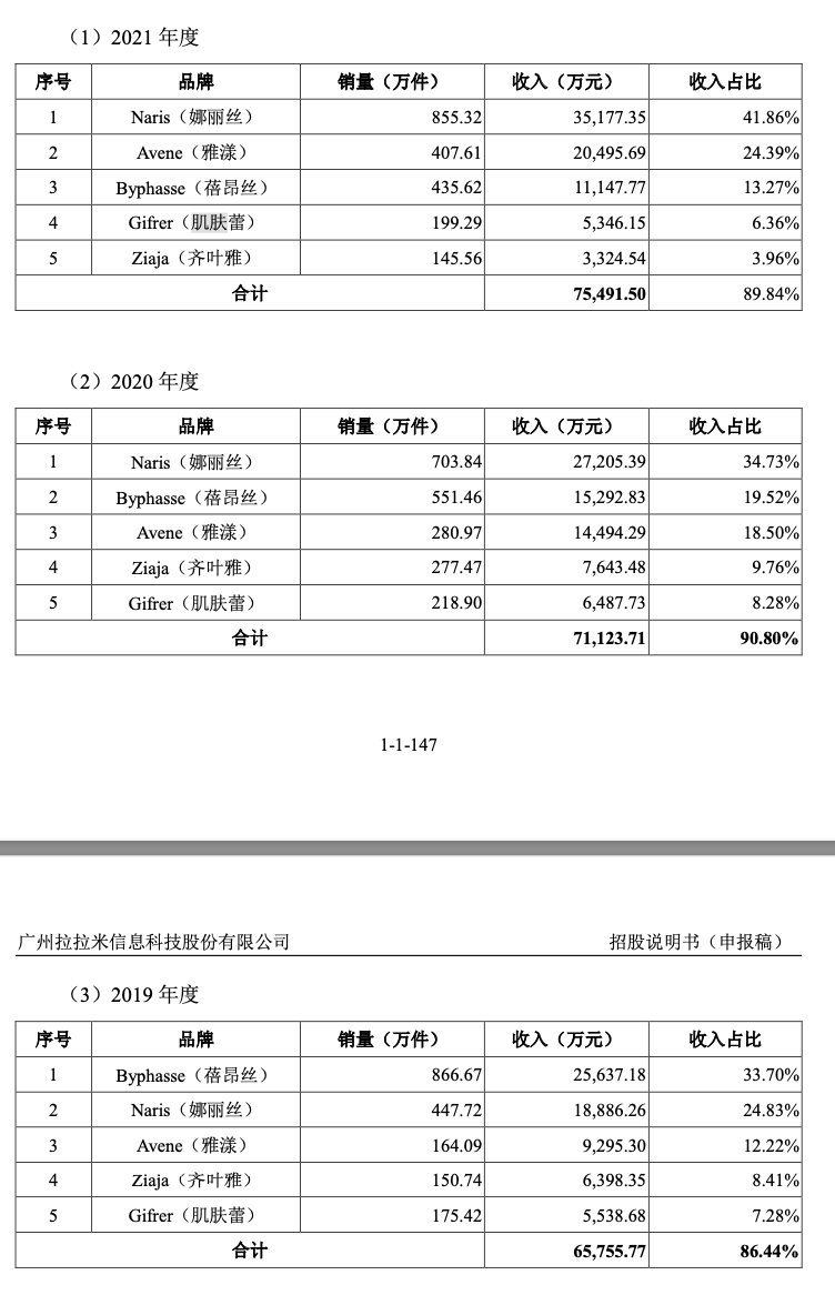 原因之一,拉拉米極度依賴小眾美妝品牌,報告期內(nèi),公司孵化的Naris(娜麗絲)、Byphasse(蓓昂絲)、Avene(雅漾)、Ziaja(齊葉雅)、Gifrer(肌膚蕾)五大美妝品牌合計(jì)占營業(yè)收入的比重分別為86.44%、90.80%、89.84%,其中娜麗絲功不可沒。