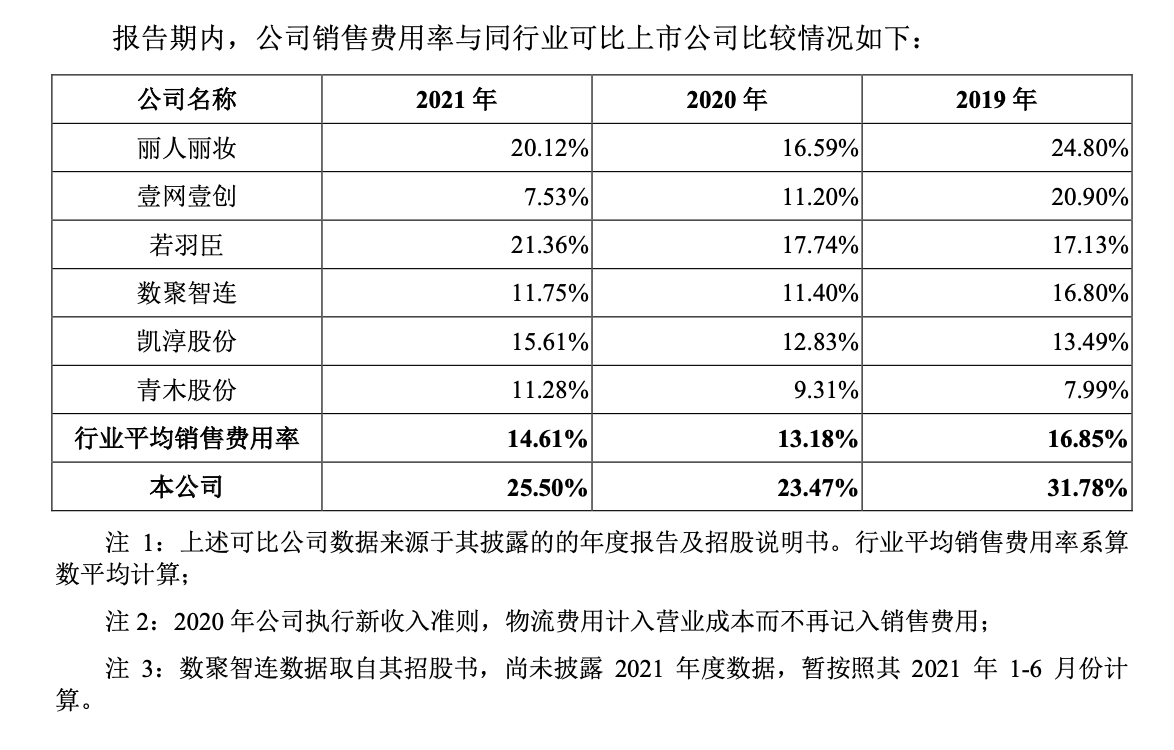 2019年-2021年,拉拉米銷售費(fèi)用分別為2.42億元、1.84億元和2.14億元,占營業(yè)收入的比重分別為31.78%、23.47%和25.50%,遠(yuǎn)超行業(yè)平均水平。其中,僅市場推廣費(fèi)分別為9283.39萬元、1.05億元和1.26億元,近三年花了3.24億元,主要分為站內(nèi)的直通車、鉆展、聚劃算、淘寶 客傭金等推廣費(fèi)和站外的通過小紅書、微博、微信等渠道進(jìn)行達(dá)人推薦、明星代言等。