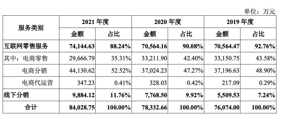 這里需要說明拉拉米的銷售模式,公司主要分為電商零售、電商分銷、電商代運(yùn)營三種互聯(lián)網(wǎng)零售模式以及線下分銷模式,報告期內(nèi)電商零售和電商分銷收入合計(jì)占比在90%左右,兩者均通過買斷品牌方產(chǎn)品并對外銷售以獲得收入,差異在于前者直接在電商平臺開設(shè)店鋪直接銷售給消費(fèi)者,后者是先銷售給下游電商分銷客戶,再由下游電商分銷客戶進(jìn)行銷售;另電商代運(yùn)營指公司向品牌方店鋪提供電商服務(wù),并向品牌方收取相關(guān)運(yùn)營服務(wù)費(fèi)。