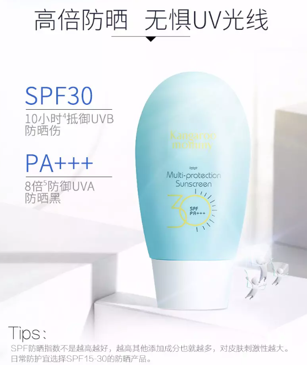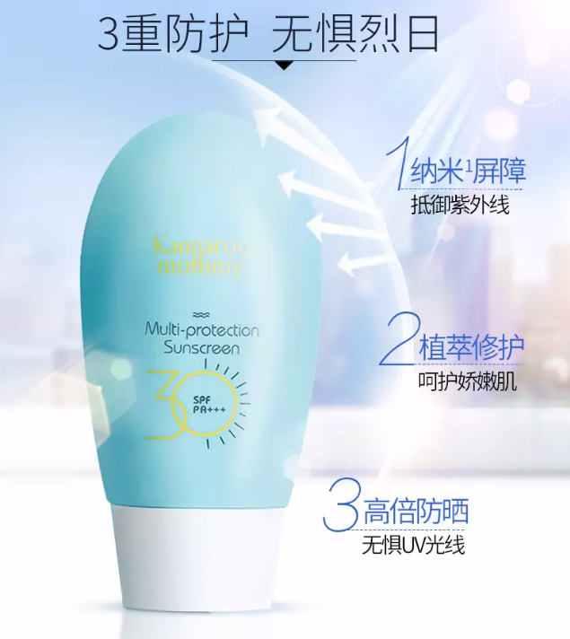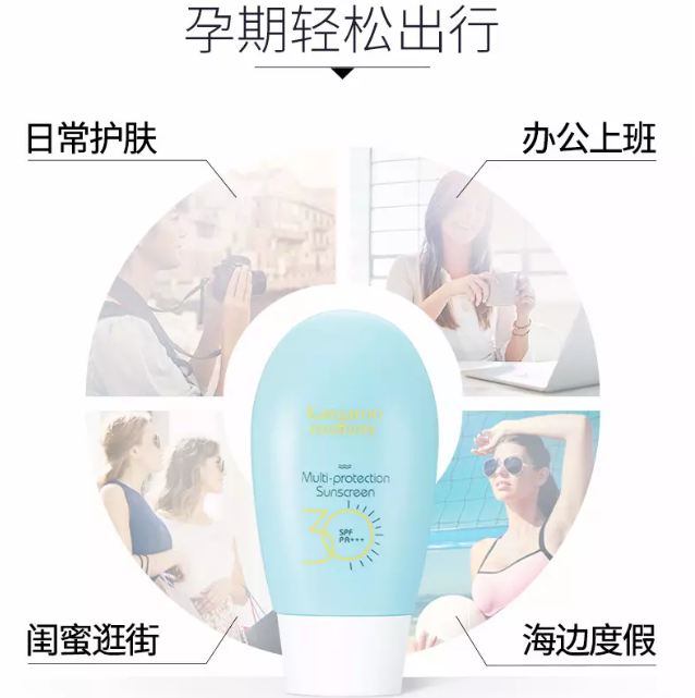 還有一種情況就是很多在生活中備孕或者是孕中或者是寶媽們對(duì)護(hù)膚防曬品的要求是比較高的,普通化妝品是不能用在這特殊時(shí)期的女性身上的,那就需要一種防曬霜來(lái)滿足這些情況,我們來(lái)了解一下袋鼠媽媽研發(fā)的產(chǎn)品——袋鼠媽媽防曬霜