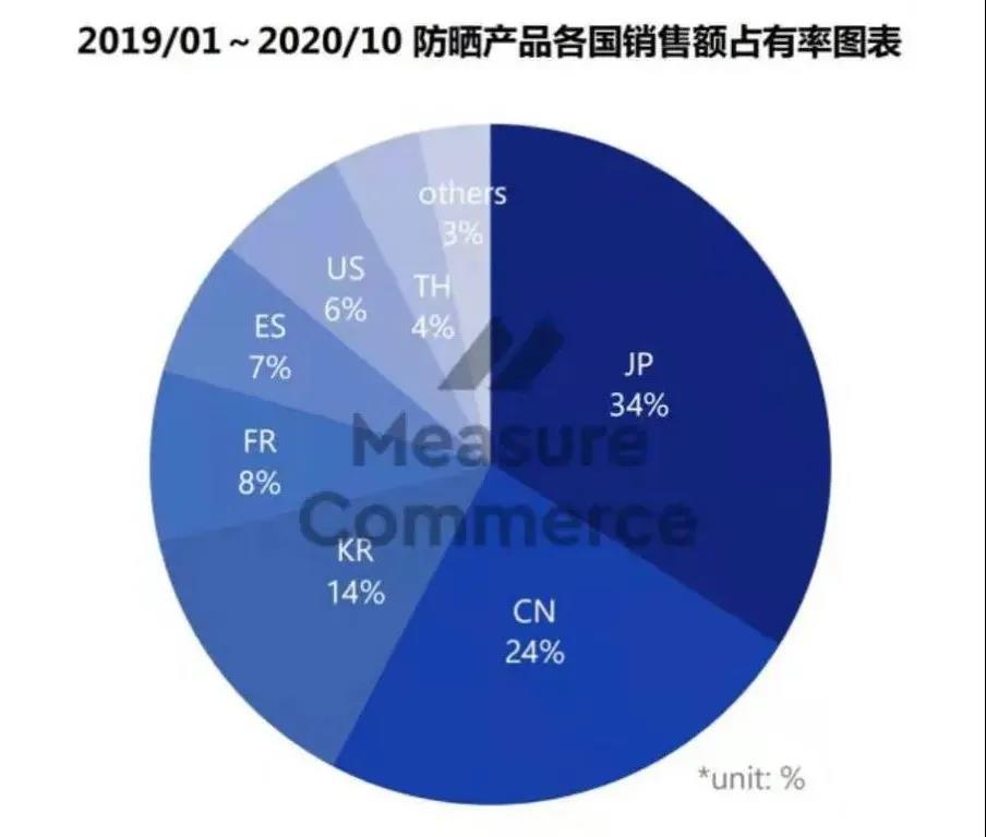 MeasureCommerce分析數(shù)據(jù)指出,2019年1月—2020年10月,來自日本、中國和韓國的防曬產(chǎn)品占據(jù)了整個防曬市場淘系電商交易額72%的份額。其中,日本防曬產(chǎn)品占34%,中國防曬產(chǎn)品占24%,韓國防曬產(chǎn)品占14%,位居前三甲。