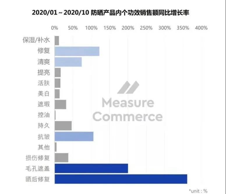 其中,使用之后能夠達到曬后修復果的產(chǎn)品銷售增長率超過350%,而能夠“遮蓋毛孔”的防曬產(chǎn)品銷售增長率達到200%。